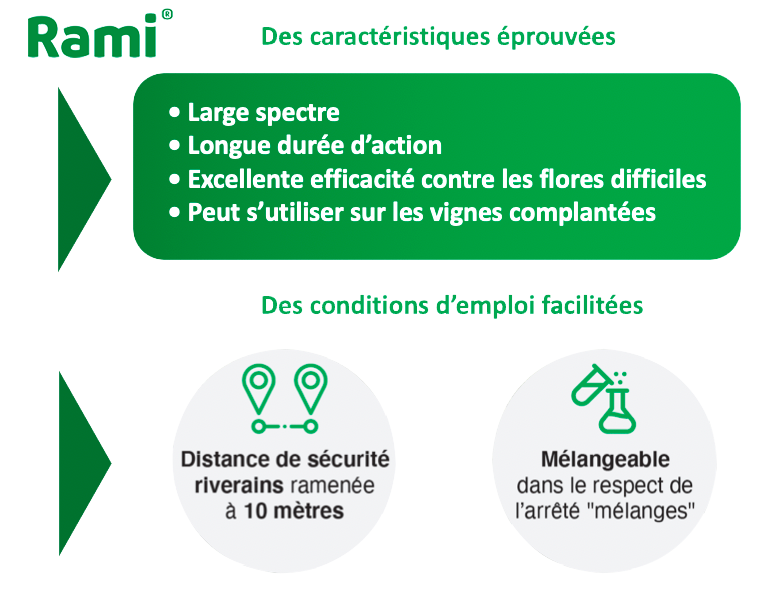 PHILAGRO France - SAS au capital de 9 912 500 € - RCS Lyon B 389 150 582 - Parc d’Affaires de Crécy - 10A, rue de la Voie Lactée - 69370 Saint-Didier-au-Mont-d’Or - Tél. 04 78 64 32 64 - PHILAGRO France est agréé par le Ministère de l’Agriculture sous la référence RH02089 pour la distribution de produits phytopharmaceutiques à destination des utilisateurs professionnels. Avant toute utilisation, assurez-vous que celle-ci est indispensable. Privilégiez chaque fois que possible les méthodes alternatives et les produits présentant le risque le plus faible pour la santé humaine et animale et pour l’environnement, conformément aux principes de la protection intégrée, consultez http://agriculture.gouv.fr/ecophyto. Pour les usages autorisés, doses, conditions et restrictions d’emploi : se référer à l’étiquette du produit, à www.phytodata.com et www.philagro.fr. RAMI® marque déposée AMM 9400280 - Flumioxazine 500 g/kg - WP - P202 - P280 - P308+P313 - P391 - SP1 - SPe2 - SPe3 - SPe3. Annule et remplace tout document antérieur de même nature 09/2021.